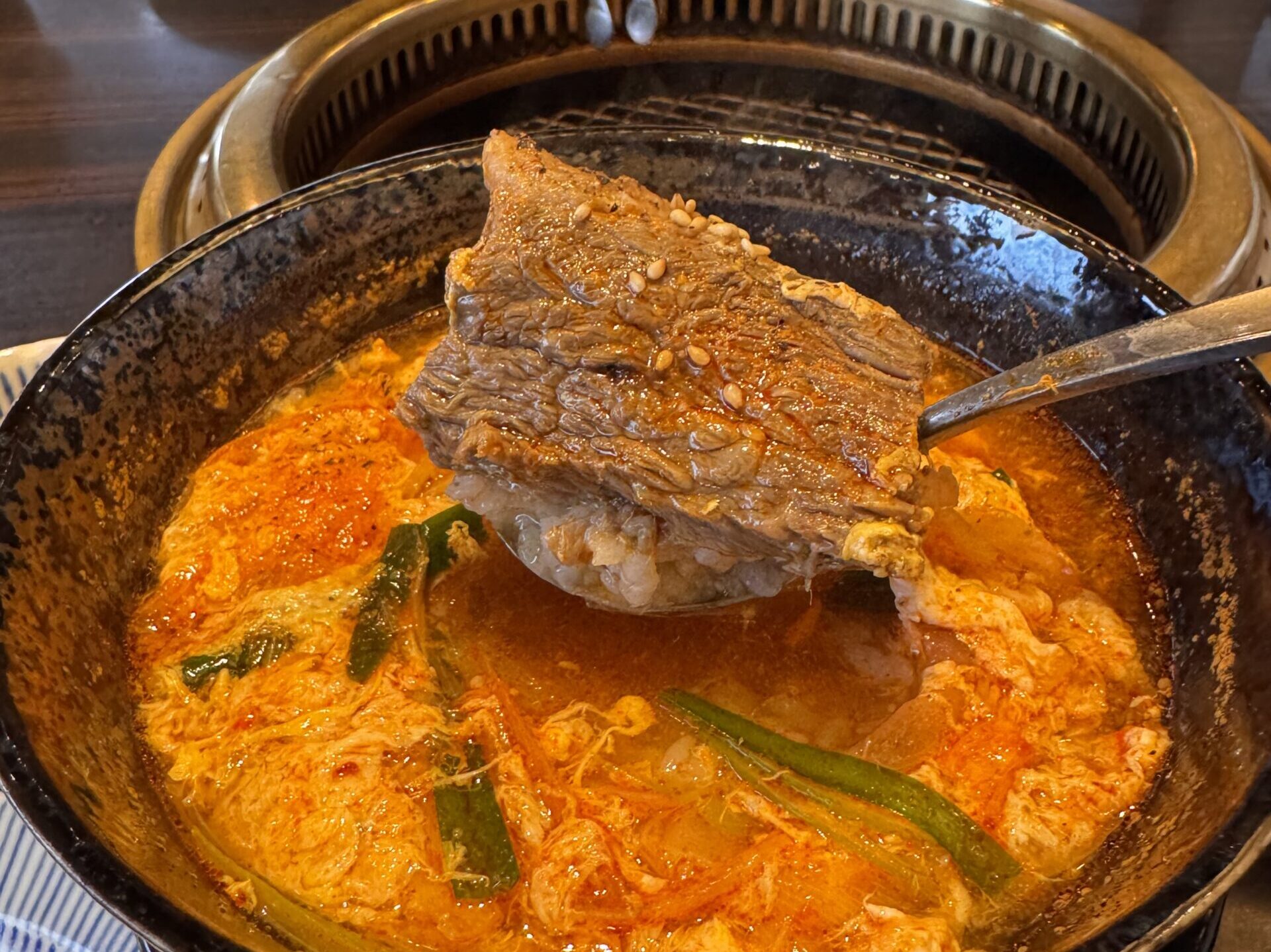 そして、もう一つの主役が「カルビクッパ」。 真っ赤な見た目から想像する刺激的な辛さではなく、思いのほかやさしい味わいです。