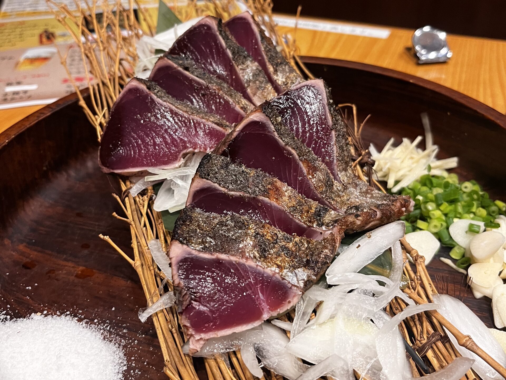 まず絶対に外せないのが、看板メニューの「鰹(かつお)藁焼き塩たたき」。 炎で表面を一気に焼き上げた鰹は、藁の香ばしさがしっかり移っています。
